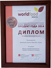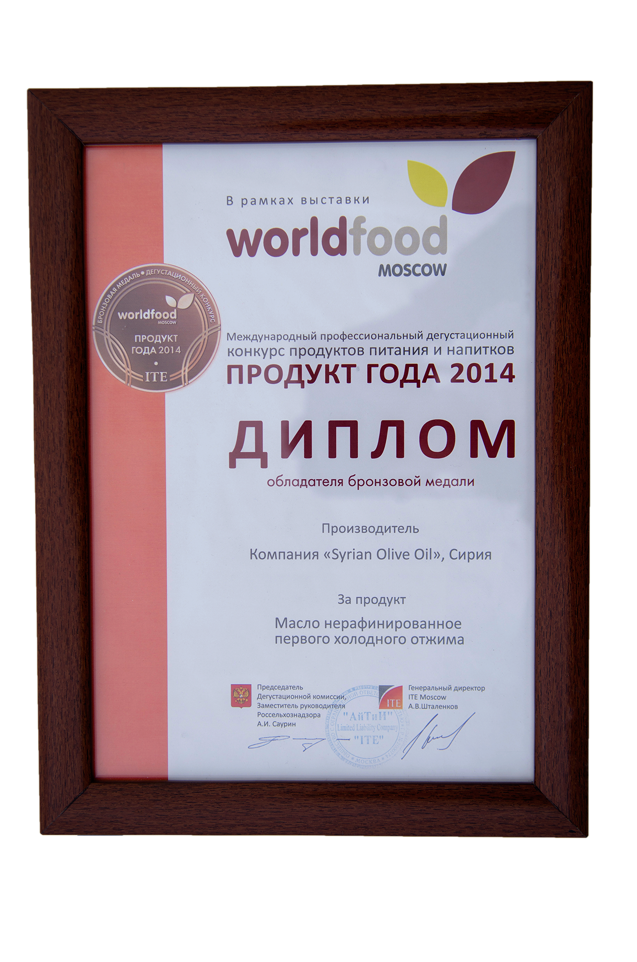 Syrian Olive Oil Company was awarded the Bronze Medal in the Olive Oil Tasting Competition at World Food Moscow 2014.