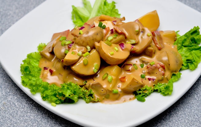 Ingredients: - 4 medium potato - 200g mushroom - 100g salami - 2 tbs. dill, finely chopped - 2 green onion leaves, chopped For French sauce: ...